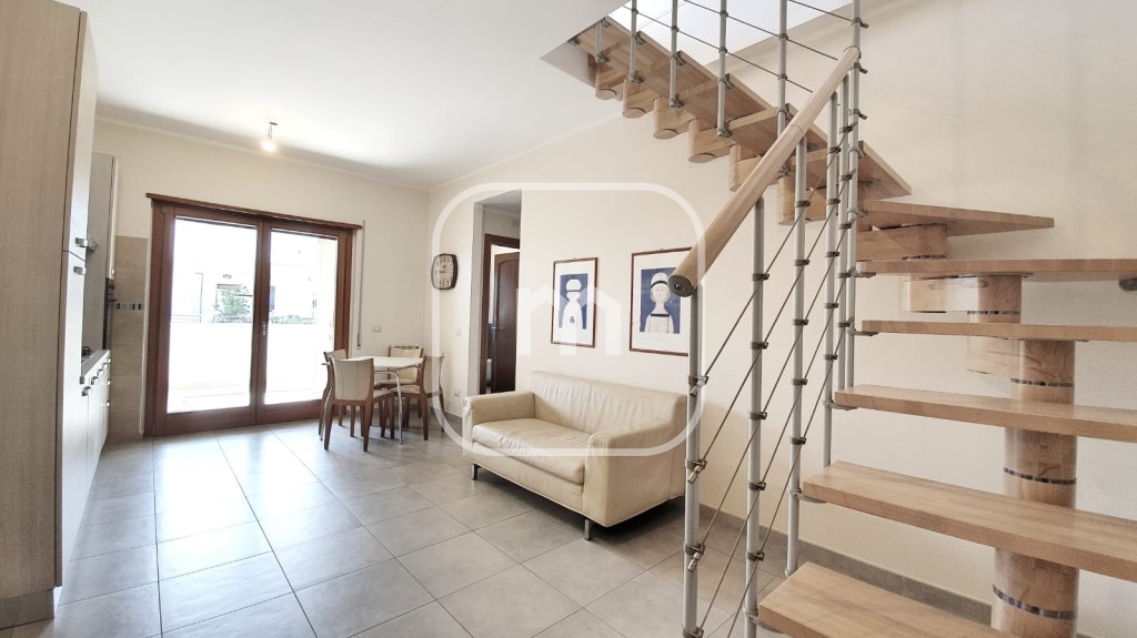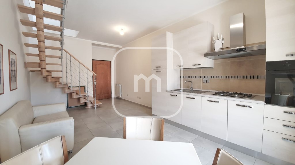 Il piano principale accoglie con una zona living elegante e armoniosa, composta da soggiorno con cucina a vista perfettamente integrata nell’ambiente. La camera matrimoniale, con pavimentazione in parquet, regala un’atmosfera calda e riservata. Completa il livello un bagno e un ampio balcone vivibile, ideale per momenti di relax all’aperto.