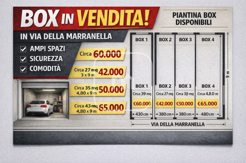 Proponiamo in vendita diverse soluzioni di box auto di varie metrature, ideali per uso privato, investimento o deposito.